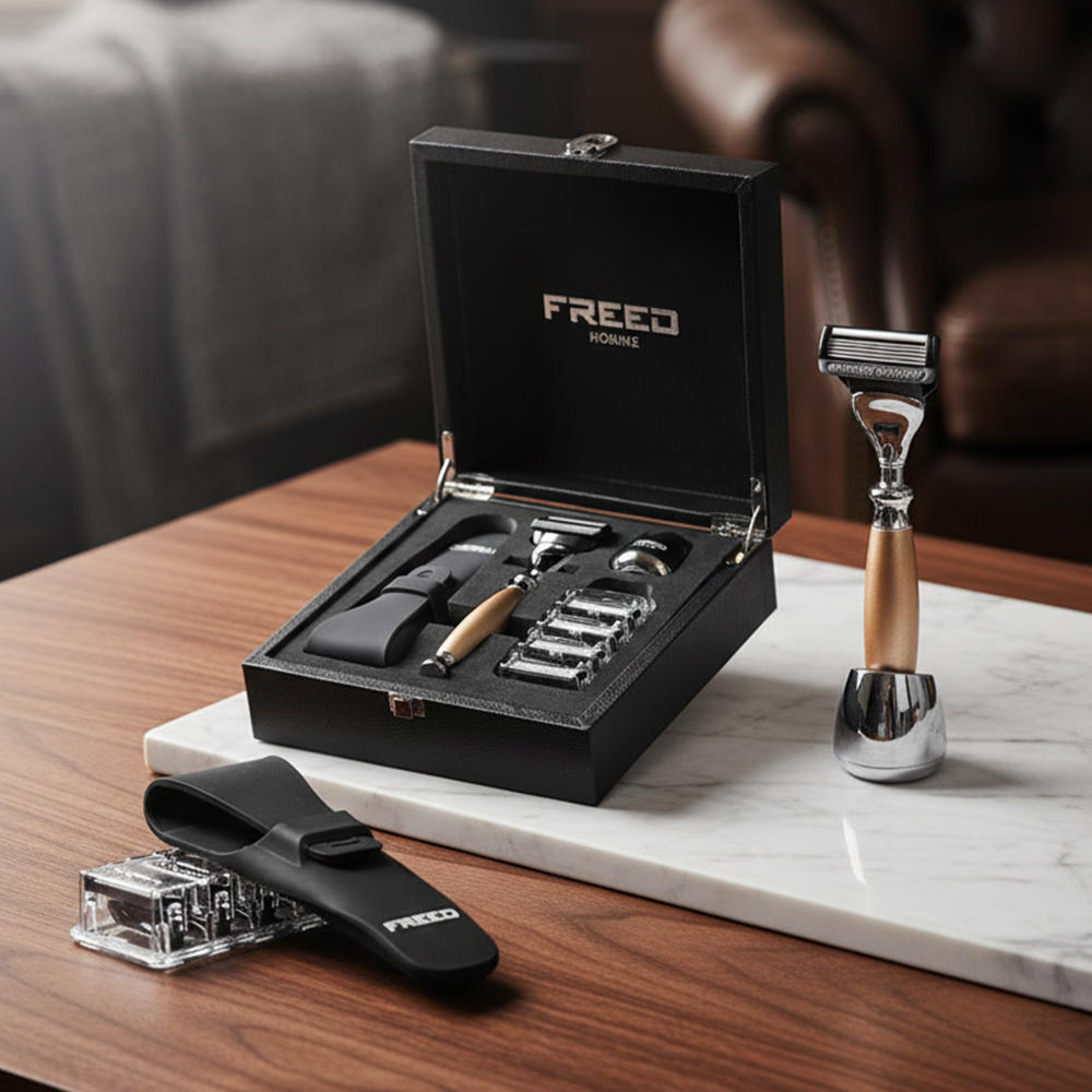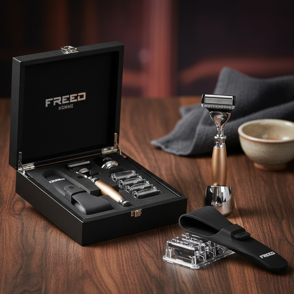 採用古銅刷色工藝搭配鋁合金材質,完美呈現男人品味的刀具,刀片採用歐洲鋼材製作而成,堅韌且鋒利的刀片使得刮鬍非常的輕鬆俐落,搭配安全裝置完美服貼肌膚角度讓刮鬍過程大幅降低受傷與鬍子拉扯的機率,全金屬材質刀身,完美的重量配比,手感操控性極佳,讓男人專屬的儀式感為您開啟每一天。
