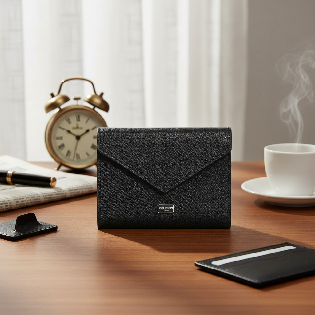 簡約俐落的信封式三折設計,完美平衡外型與收納機能,體現都會男士的專業與細節品味。
