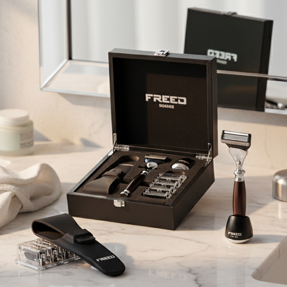 這是 FREED 尊爵系列的標準四件組。刀柄的顏色決定這套的性格,其他三件(旅行套、底座、刀片)圍繞它配置。
