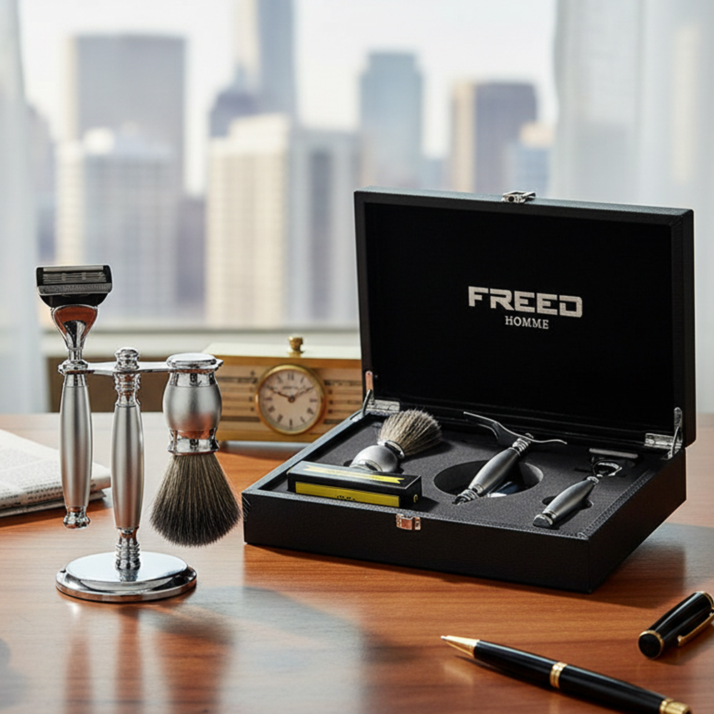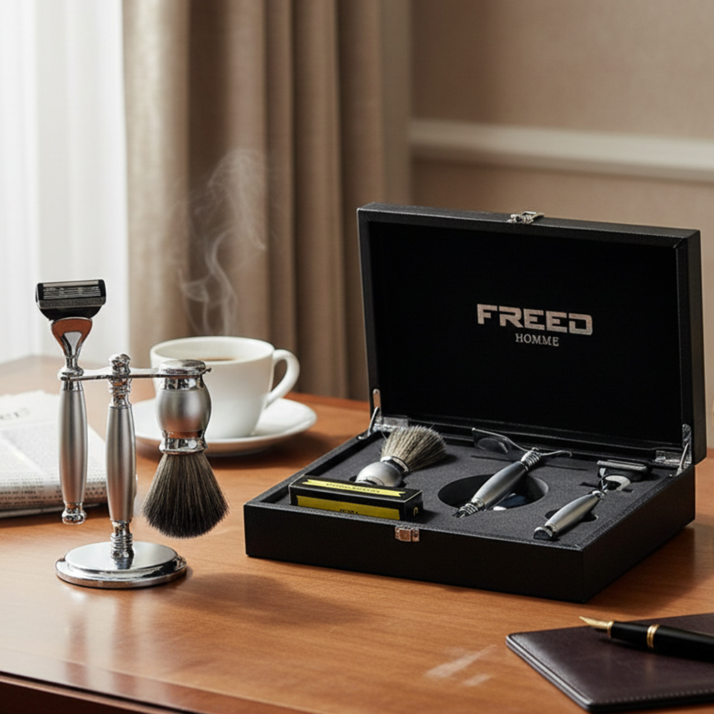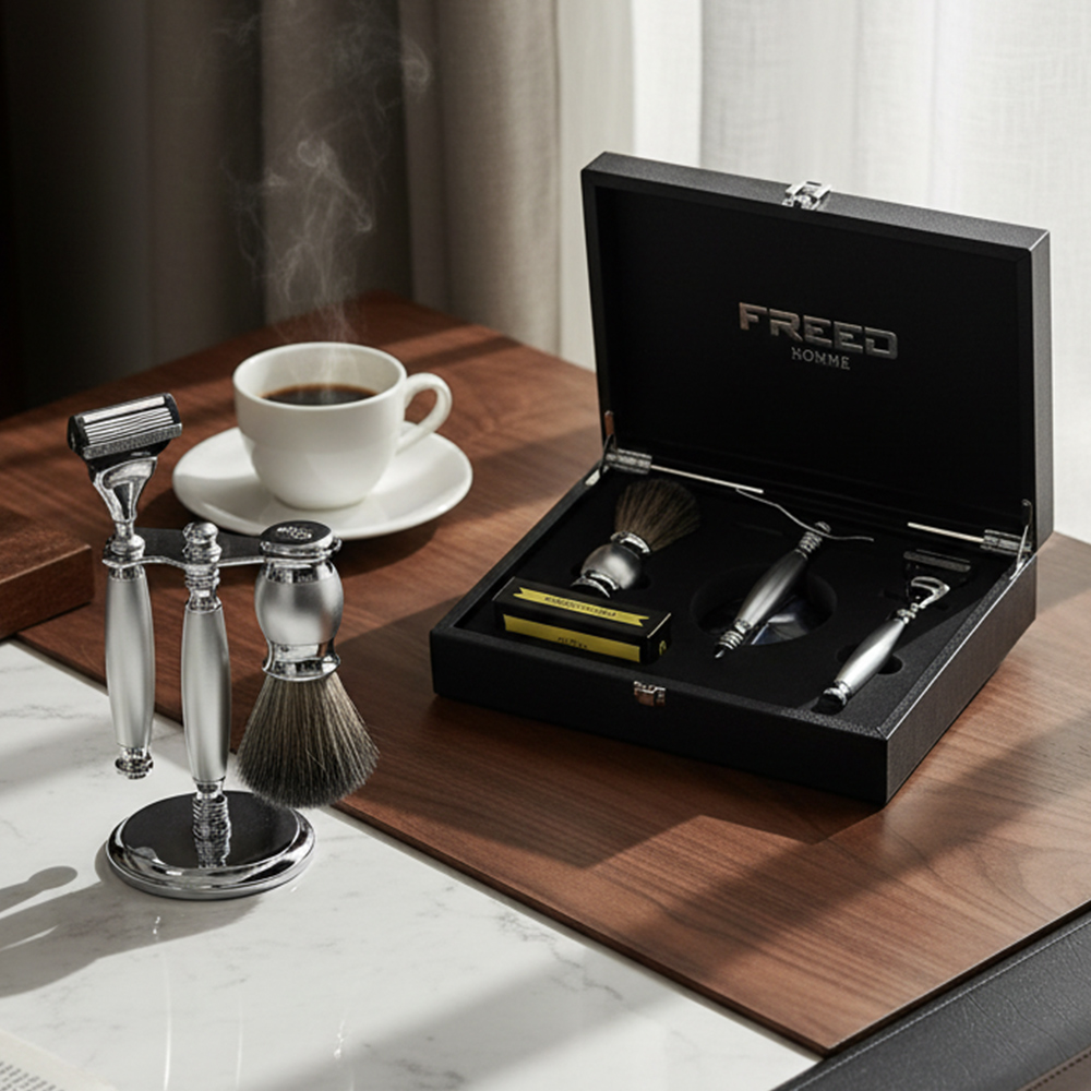 鬍前搭配 FREED 刮鬍精華露滋潤肌膚;鬍後純露鎮定保養。