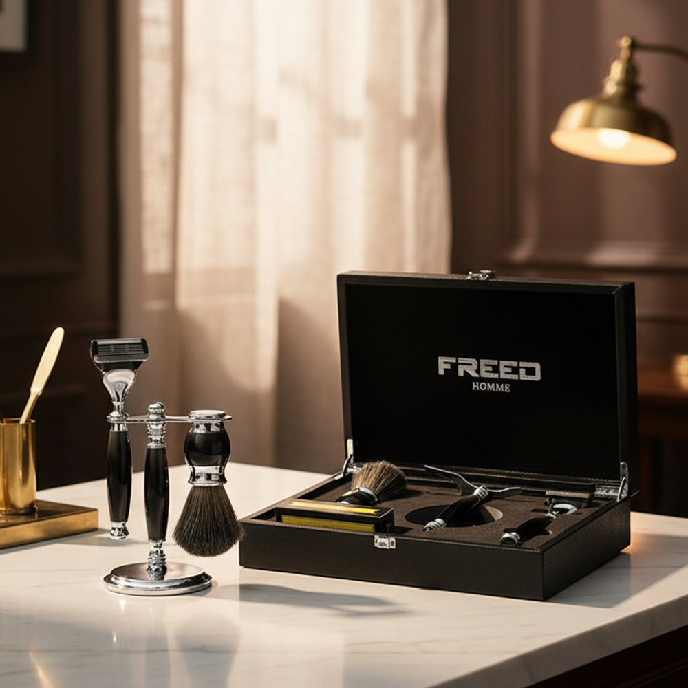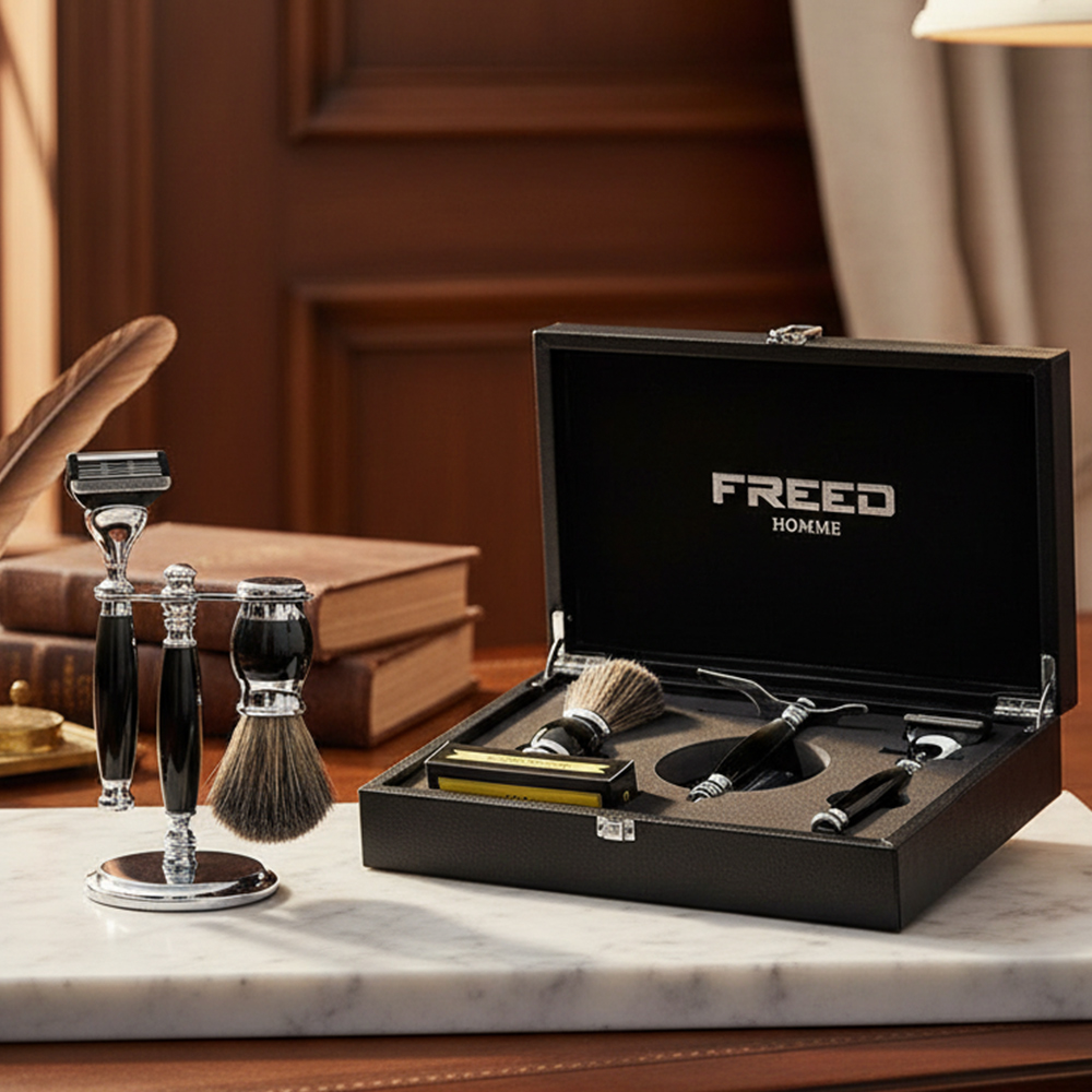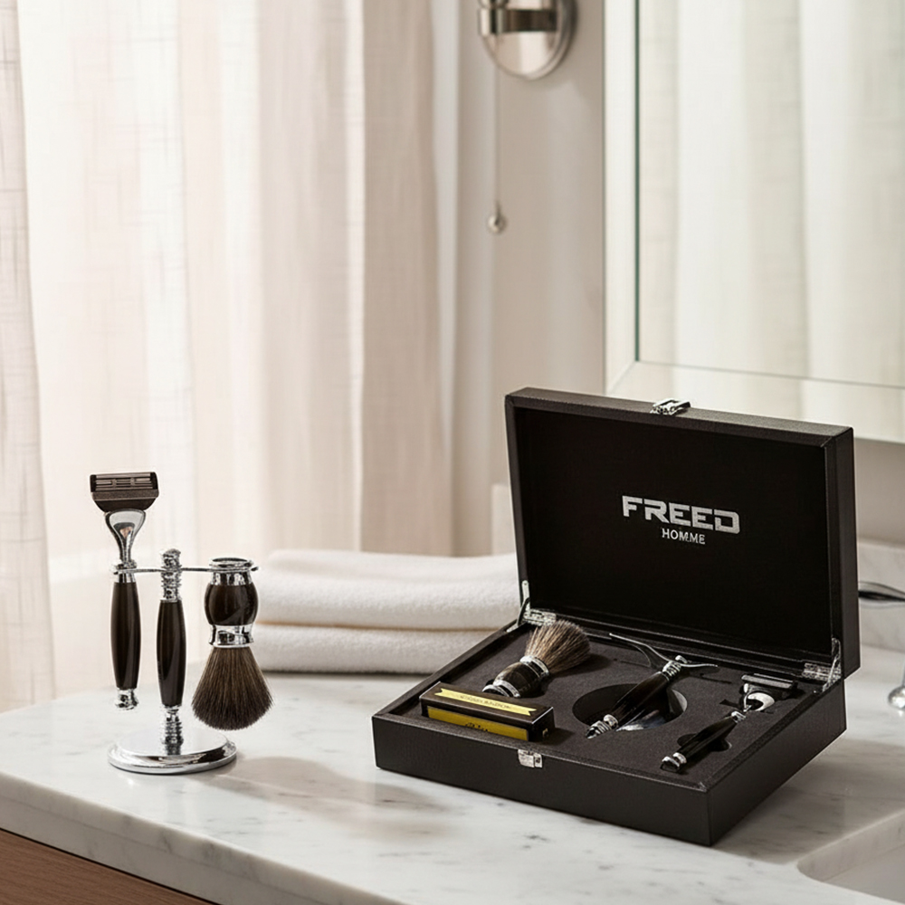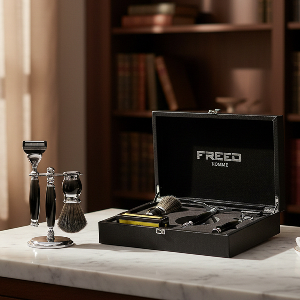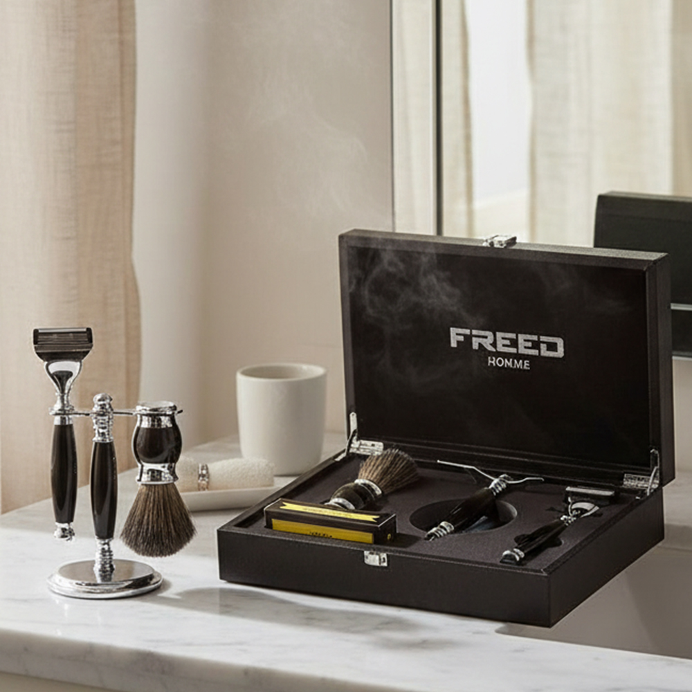 鬍前搭配 FREED 刮鬍精華露滋潤肌膚;鬍後純露鎮定保養。