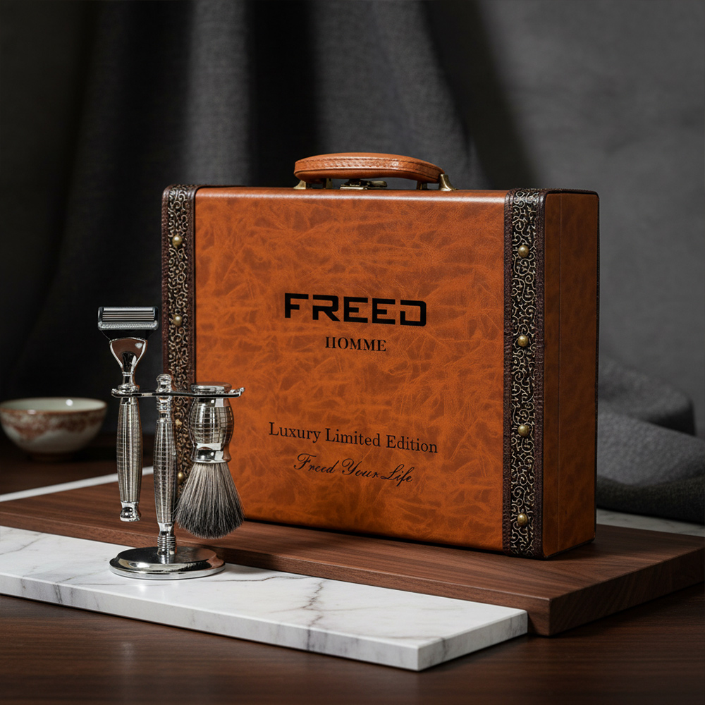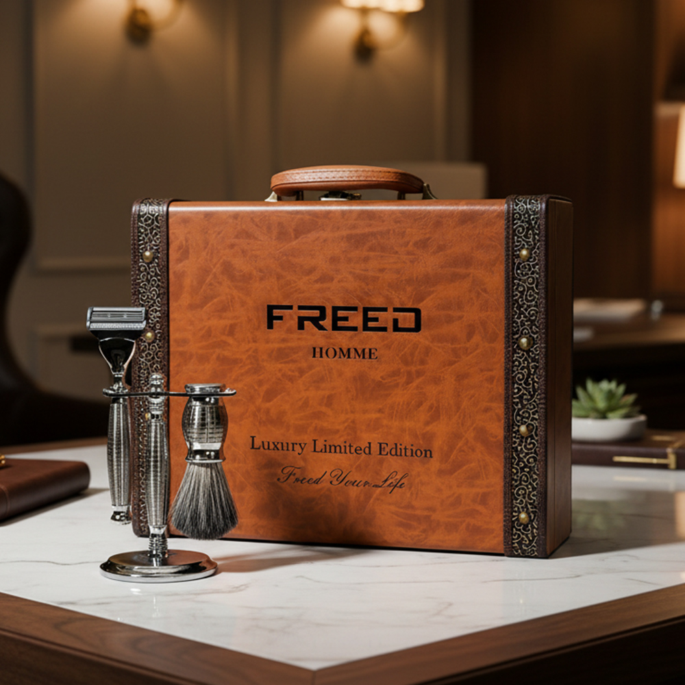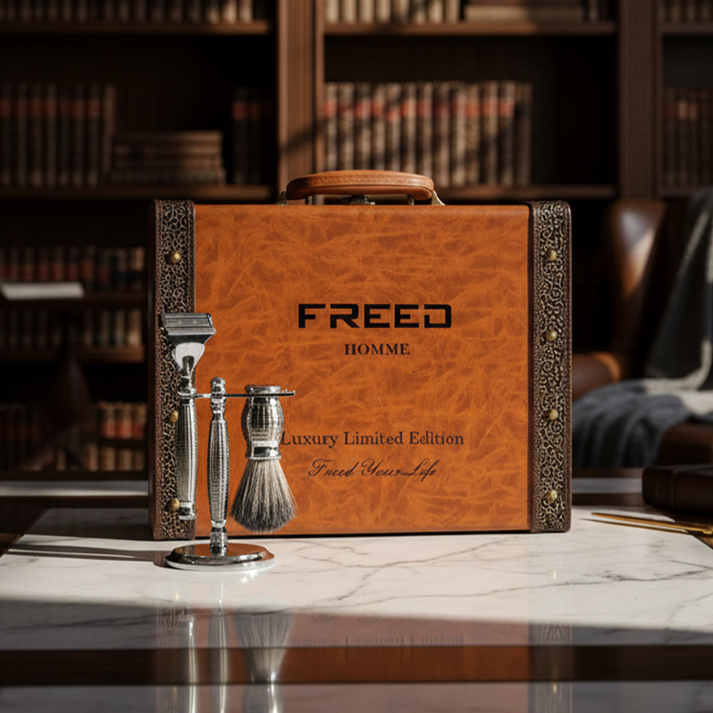 FREED 豪華典藏版。配置跟豪華四件組相同(刀柄 / 刀架 / 鬍鬚刷),但刀片量增加為 五刀式 4 片 × 3 盒——一次備好數年的耗材。