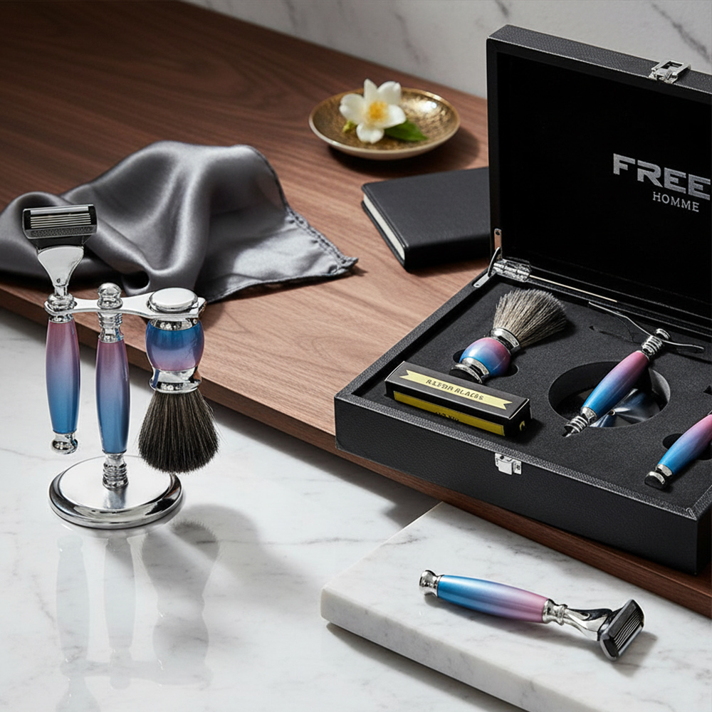 | 材質 | 鋁合金 + 全金屬刀頭 + 鍍鉻豪華刀架 + 鬍鬚刷 |