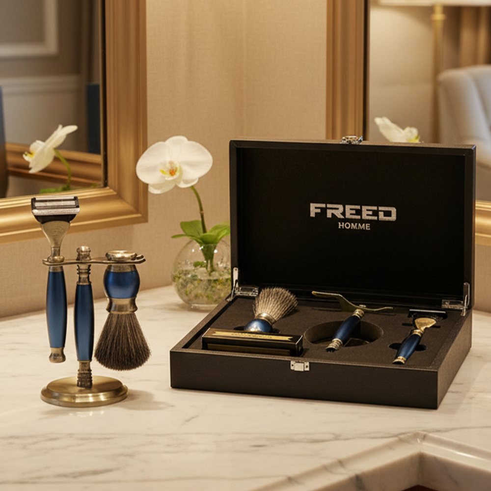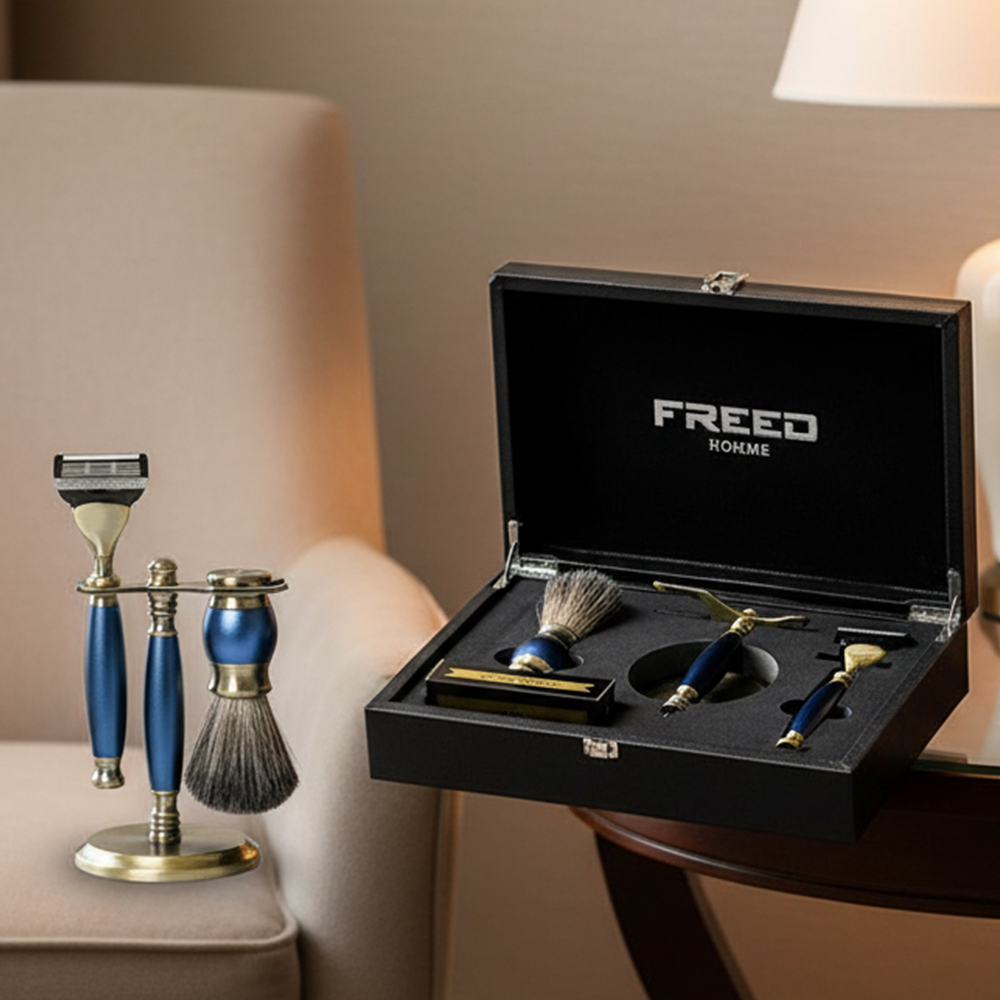 五刀式古銅刮鬍刀豪華禮盒四件組 - 帝王藍