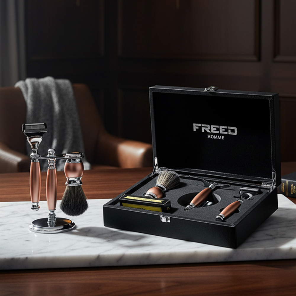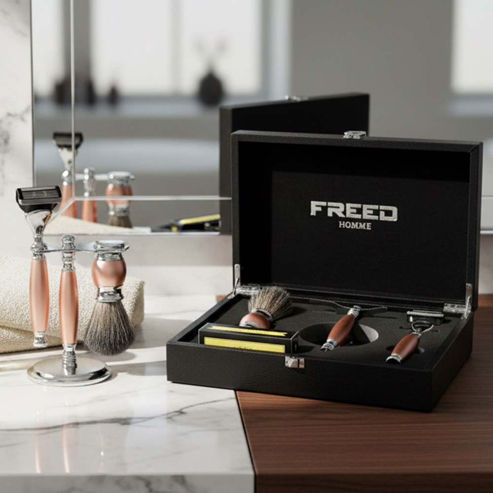 鬍前搭配 FREED 刮鬍精華露滋潤肌膚;鬍後純露鎮定保養。