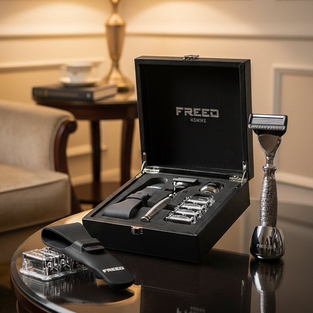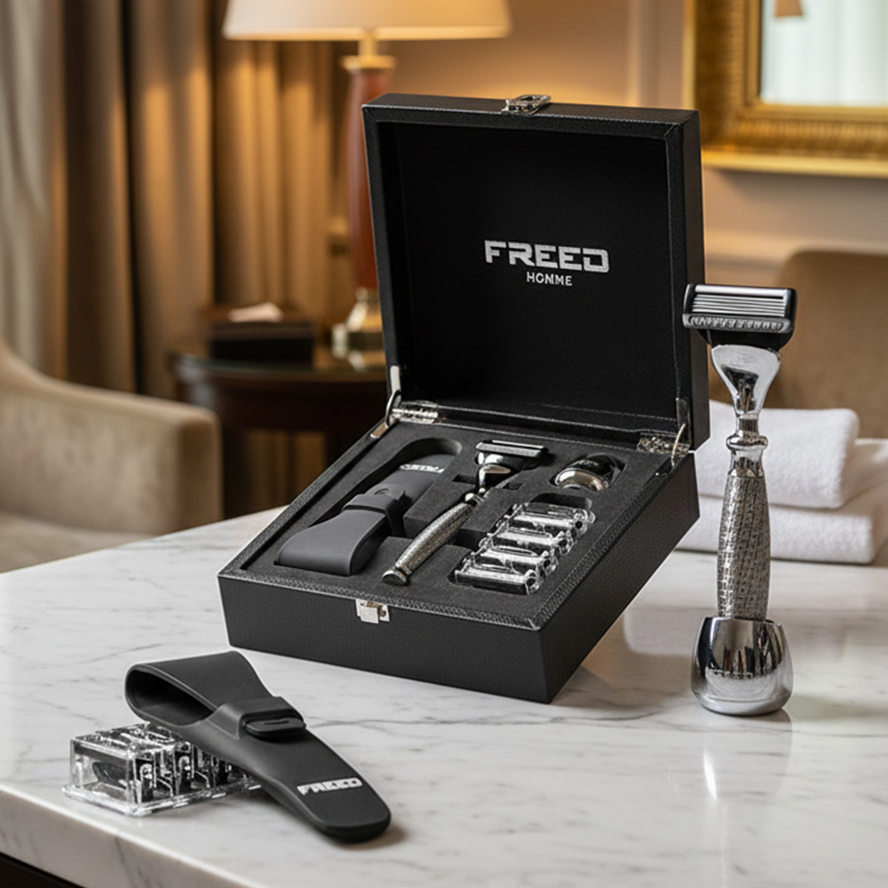 這是 FREED 尊爵系列的標準四件組。刀柄的顏色決定這套的性格,其他三件(旅行套、底座、刀片)圍繞它配置。