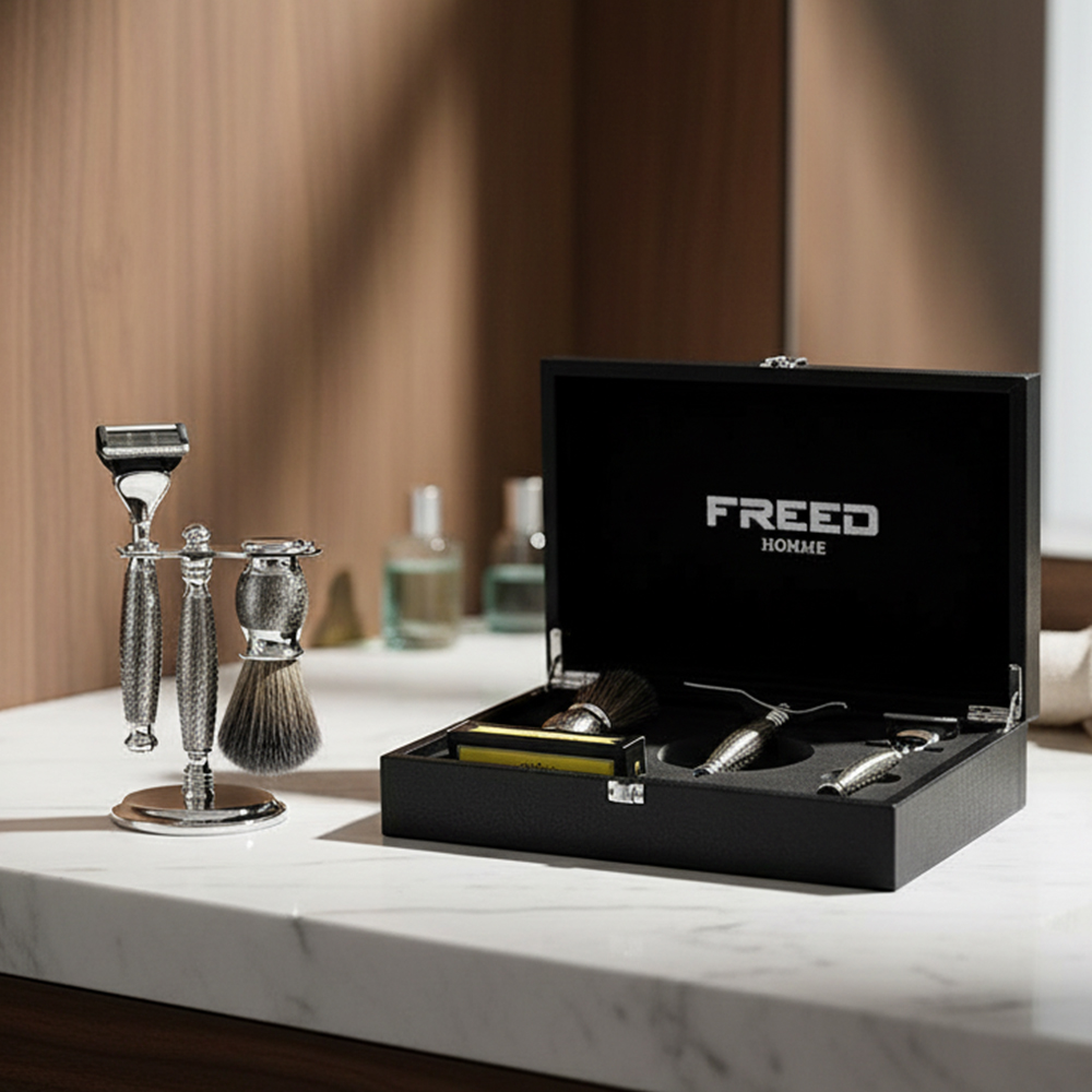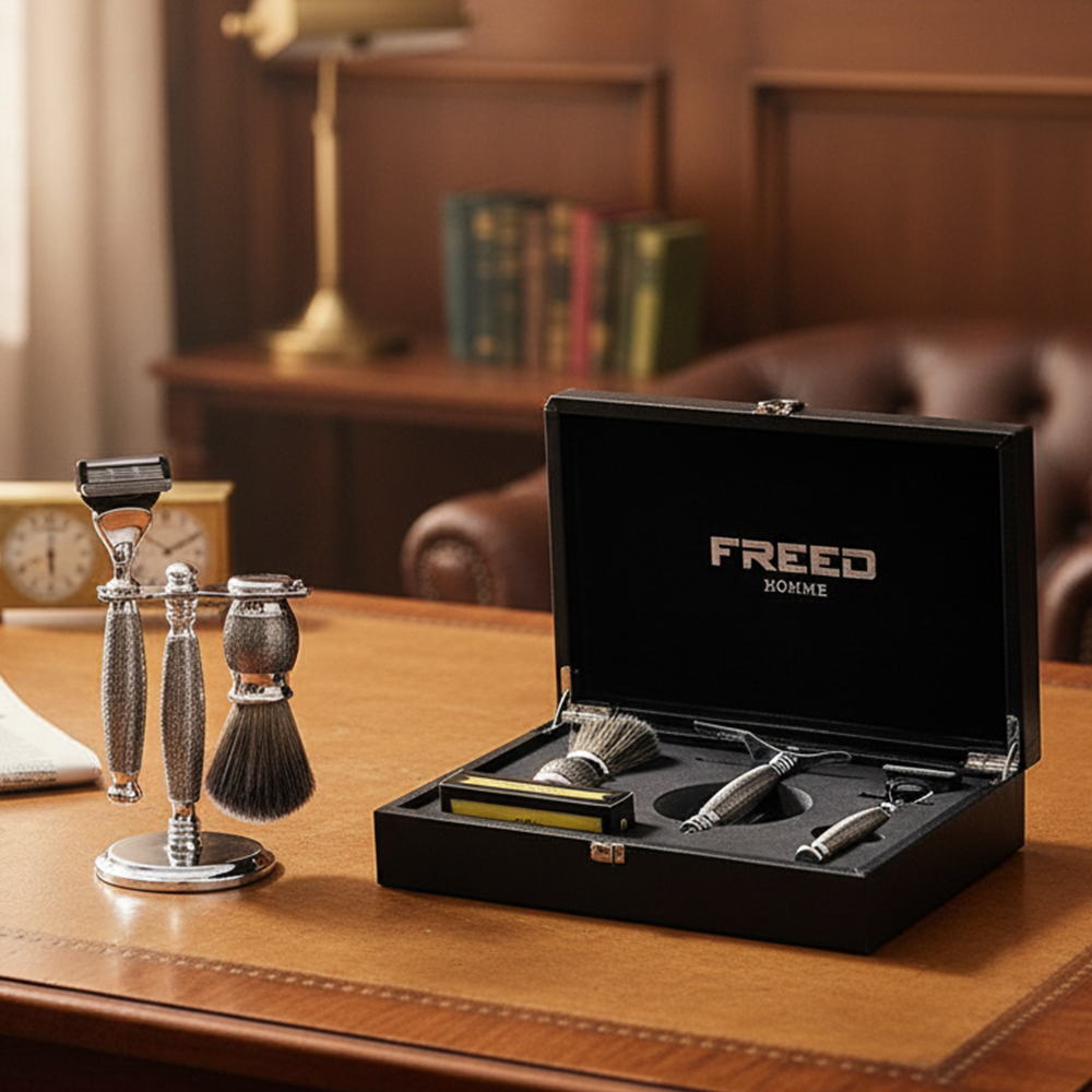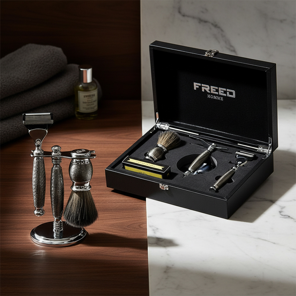 FREED 標準豪華四件組。刀柄 + 豪華刀架 + 鬍鬚刷 + 整盒刀片,完整修容儀式物件。