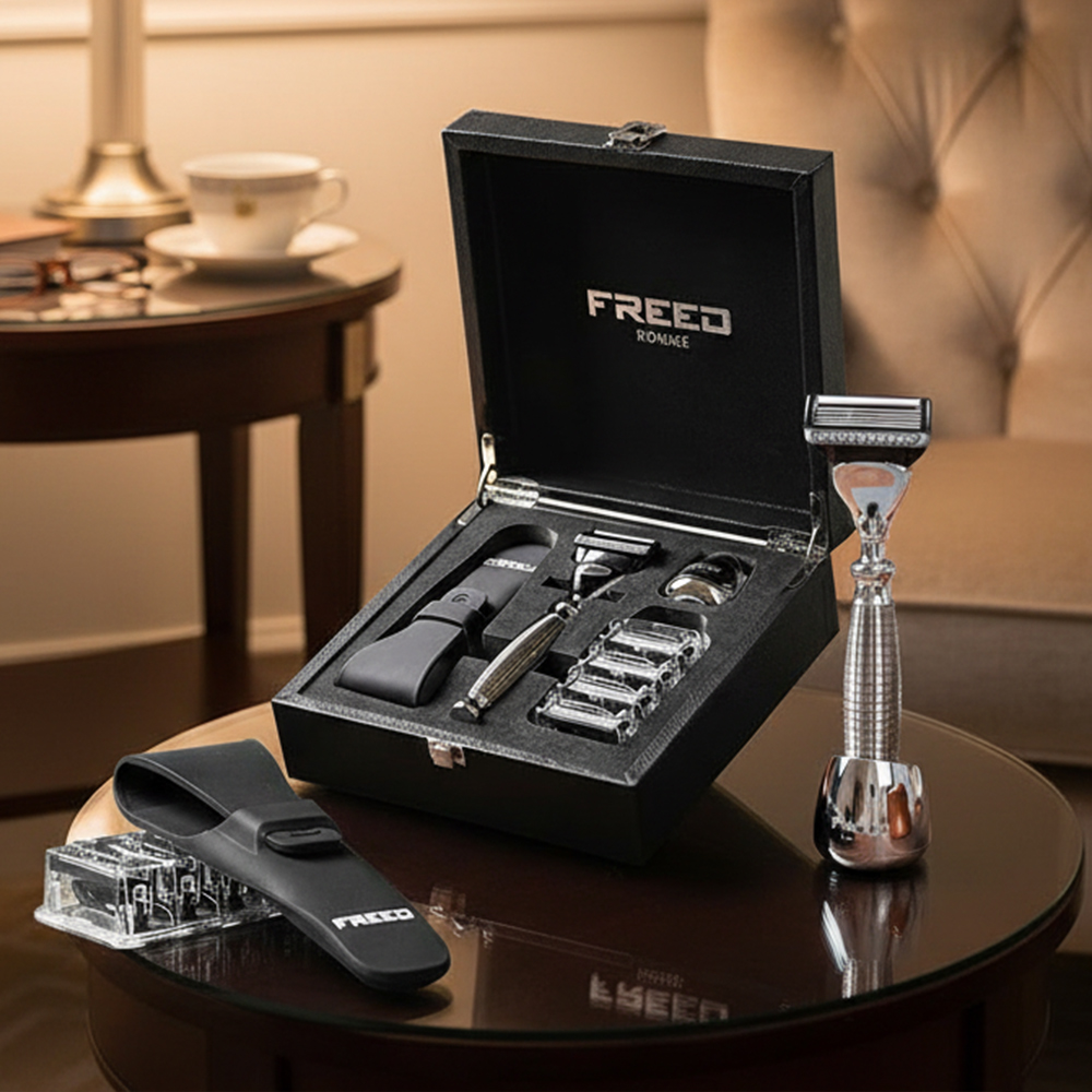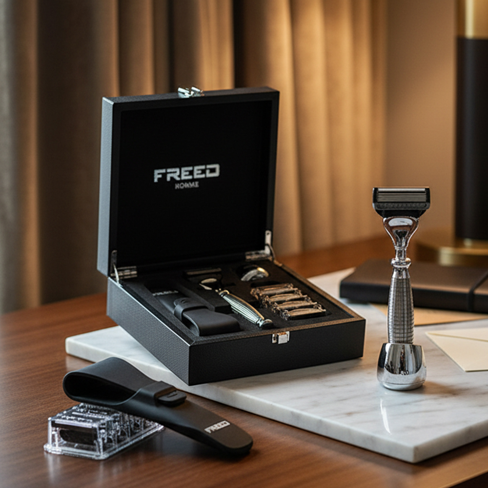 這是 FREED 尊爵系列的標準四件組。刀柄的顏色決定這套的性格,其他三件(旅行套、底座、刀片)圍繞它配置。