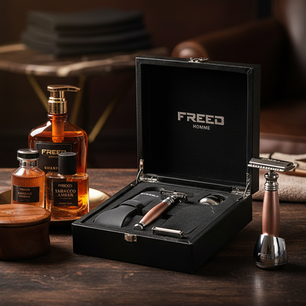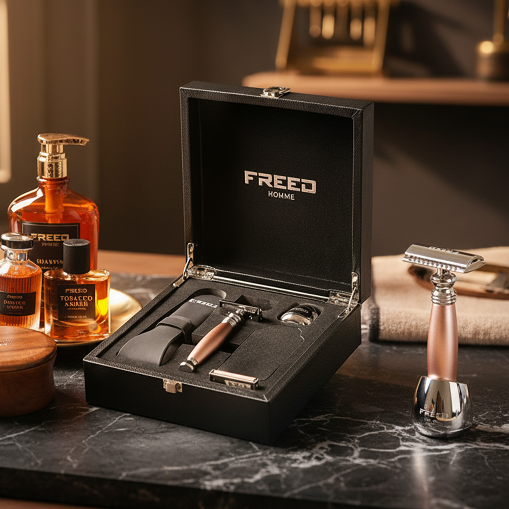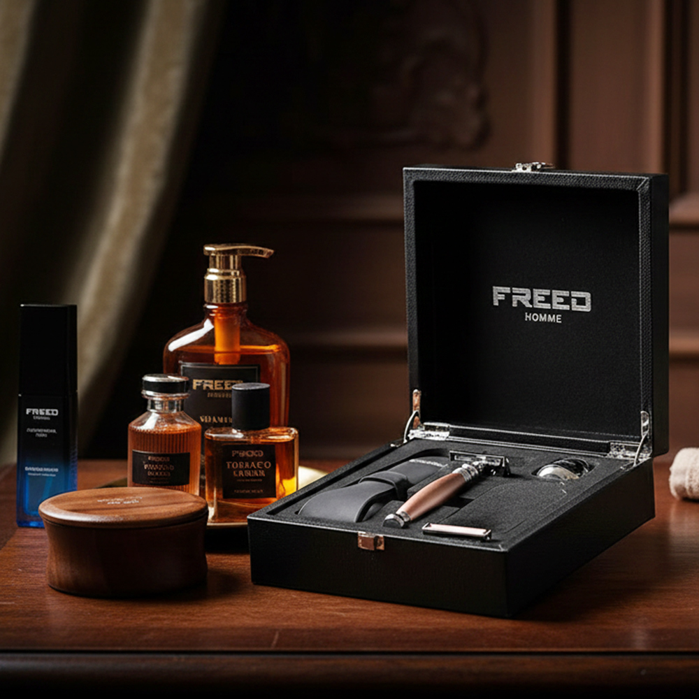 鬍前搭配 FREED 刮鬍精華露滋潤肌膚;鬍後純露鎮定保養。